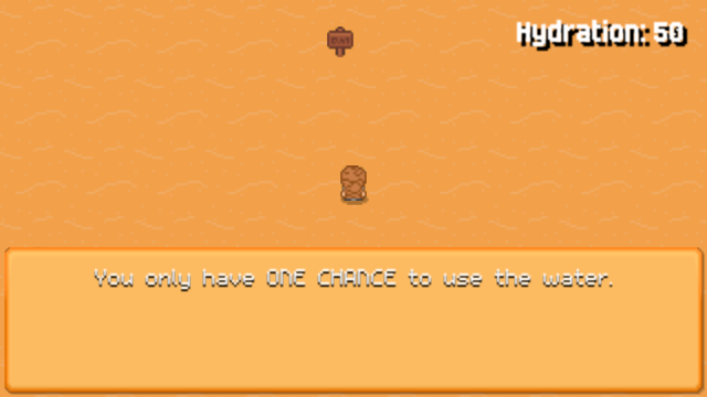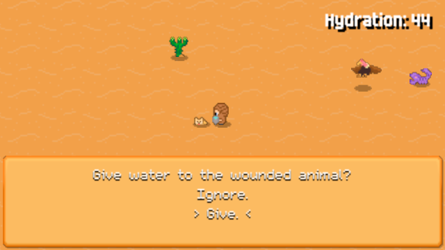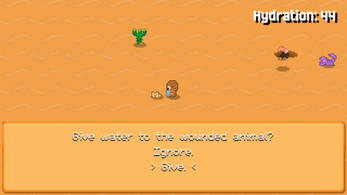 You are a wanderer on a final pilgrimage through the desert. Your life depends on a single sip of water, but the journey is filled with situations that test your morals, asking for a sacrifice. What will you do when the thirst of the world crosses your path?